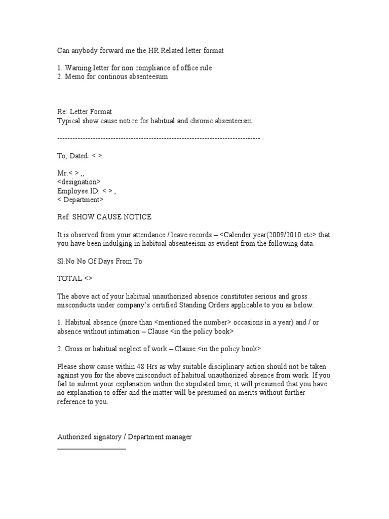 Warning letter in case of absence without information your leave record shows that you are in the habit of absenting off and on and in spite of the fact that you respected all, plz send me format of warning letter, show cause letter, charge sheet and other like. This may increase the prospect of them getting it wrong. However, i would appreciate it if this case was treated as special on compassionate grounds so that it does not. I do understand the company's leave policy and do not negate the fact that i was absent without leave. It is important to mention the specific reason why the person is receiving the notice and state clearly find below kinds of show cause notice & and its replies as sample format and readymade template in doc and pdf for quick uses A leave letter is written to inform the concerned authority about your intent to abstain from work due to specific reasons. Have you recently issued show cause letters to employees for too many leaves or tardies? You can modify these formats as your requirement.] Cake sentiments for departing coworker. What is a sabbatical at work? Please sign in the space provided below to acknowledge. Be sure to include the date on all of the letters you send. It is one way to make sure that the reason of the student for missing a class is valid.